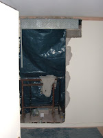Lots of plastic was used to cover over the roof to try and make it waterproof as possible, once this was done the builders started to knock through the walls upstairs, from the two main bedrooms into the new extension. A steel box lintel was put in across the 3m+ span that was newly formed. The plumber worked downstairs and ran the waste pipe between the joists and got some hot and cold pipes in position.
